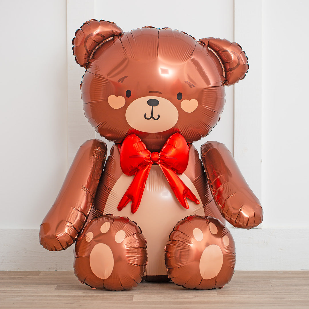 Μεγάλο μπαλόνι χαριτωμένος αρκούδος με κόκκινο φιόγκο και καρδούλες στα μαγουλάκια. Φουσκώνεται με αέρα και στέκεται καθιστός, προσφέροντας μια εντυπωσιακή και ρομαντική διακόσμηση!