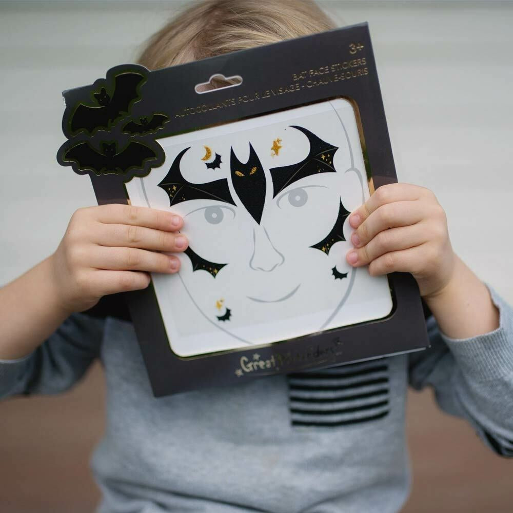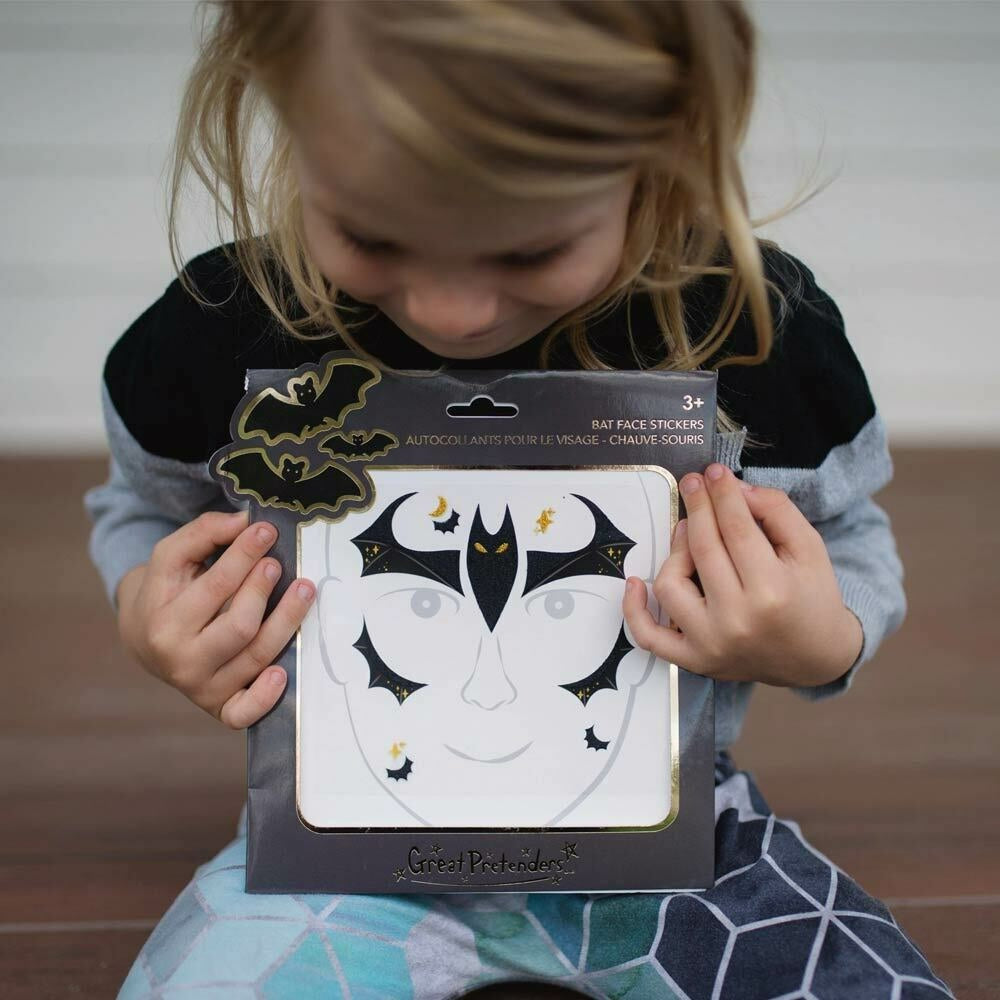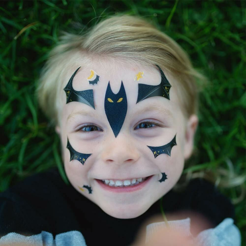 Τα αυτοκόλλητα αυτοκόλλητα προσώπου μοιάζουν πολύ με το face painting χωρίς άγχος για τη μαμά! Αυτό το σετ με 9 αυτοκόλλητα έχει σχεδιαστεί με μαύρο και χρυσό glitter, φτιαγμένο για να κάθεται όμορφα στο πρόσωπο ενός παιδιού. Απλώς ξεφλουδίστε και κολλήστε στα μάγουλα και το μέτωπό σας για να μεταμορφωθείτε σε ένα παιδί-νυχτερίδα!