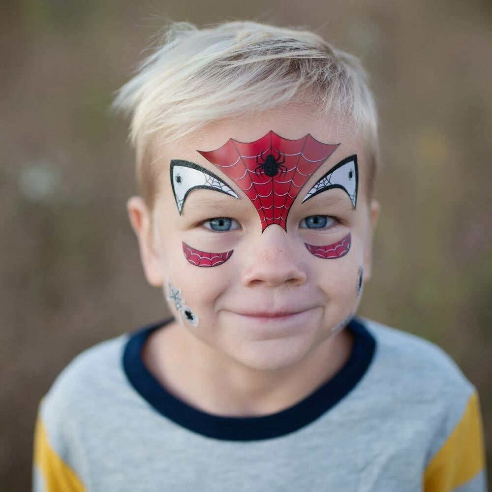 Αυτό το σετ με 8 αυτοκόλλητα έχει σχεδιαστεί με μαύρο glitter, φτιαγμένο για να κάθεται όμορφα στο πρόσωπο ενός παιδιού. Απλώς ξεφλουδίστε και κολλήστε στα μάγουλα και το μέτωπό σας για να μεταμορφωθείτε σε παιδί-αράχνη!