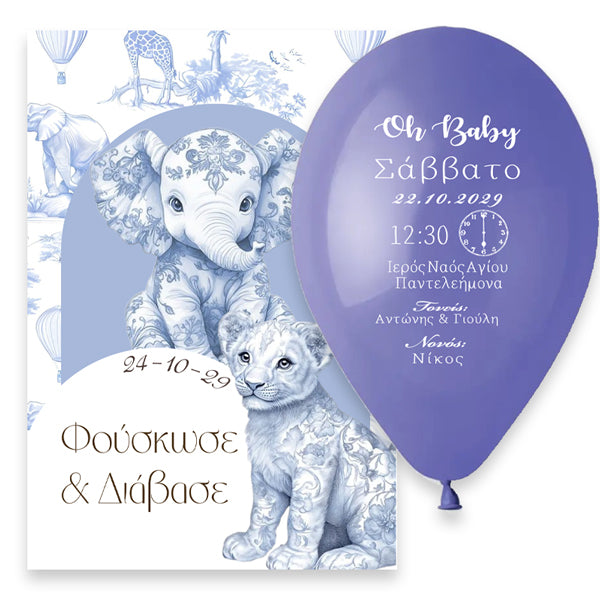 Πρωτότυπο προσκλητήριο βάπτισης σε τυπωμένο μπαλόνι με θέμα Blue Toile Ζώα Της Ζούγκλας. Οι καλεσμένοι θα πρέπει να φουσκώσουν το τυπωμένο μπαλόνι για να μάθουν τις λεπτομέρειες της βάπτισης!