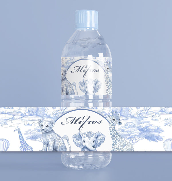 Ετικέτες για μπουκαλάκια νερού με θέμα Blue Toile Ζώα Της Ζούγκλας και εκτυπωμένο το όνομα του μωρού σας.