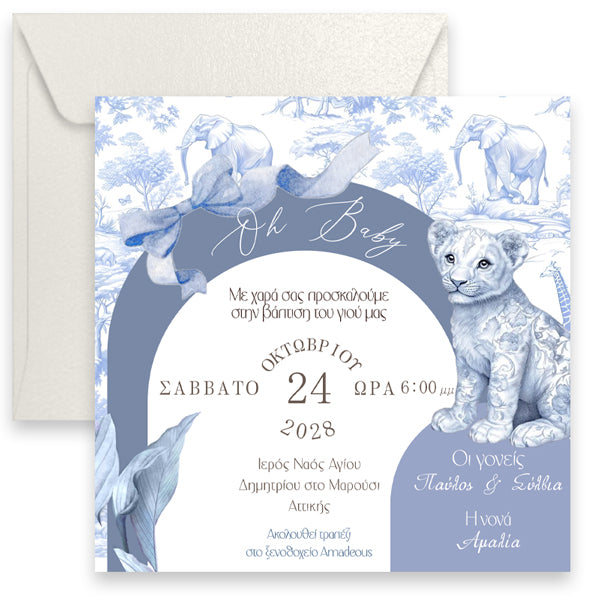 Προσκλητήριο Βάπτισης με θέμα Blue Toile Ζώα Της Ζούγκλας, για να μοιράσετε στους αγαπημένους σας για τη βάπτιση του μικρού σας και να κλέψετε τις εντυπώσεις.