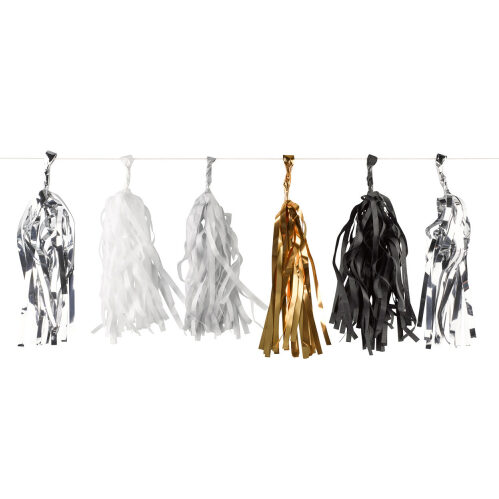 Γιρλάντα με φούντες σε χρώματα ασημί, λευκό, χρυσό και μαύρο για μία γιορτινή διακόσμηση στο χώρο σας!