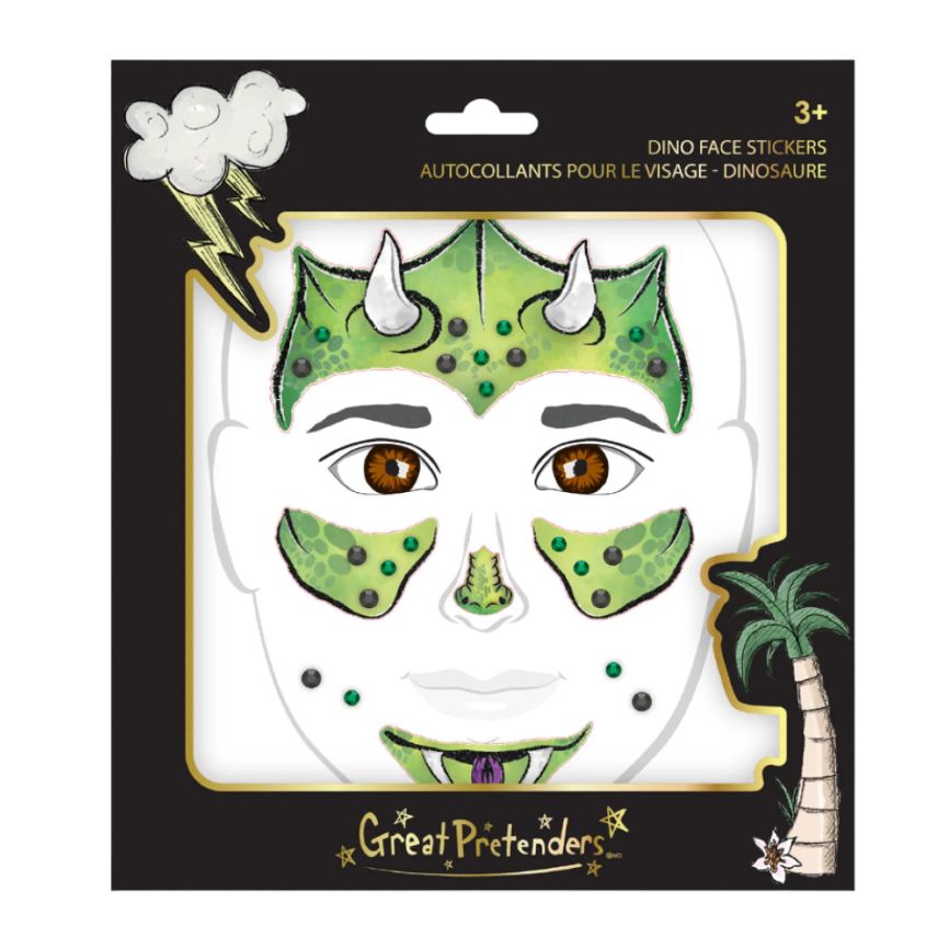 Σετ αυτοκόλλητα Δεινοσαύρου με τρισδιάστατα πετράδια, φτιαγμένα για να κάθονται όμορφα στο πρόσωπο ενός παιδιού. Απλώς ξεφλουδίστε και κολλήστε στα μάγουλα και το μέτωπό.