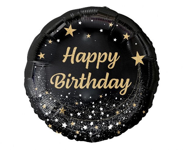 Εντυπωσιακό στρογγυλό μαύρο μπαλόνι γενεθλίων με σχέδιο χρυσά αστέρια και μήνυμα ""Happy Birthday""! Μια όμορφη ιδέα για διακόσμηση πάρτυ ή για δώρο στον εορτάζοντα!