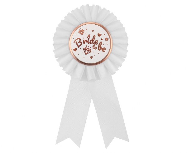 Κονκάρδα παράσημο ""Bride to be"" σε λευκό χρώμα με ροζ-χρυσά γράμματα, για να φορέσει η μέλουσα νύφη και να ξεχωρίζει στο Bachelor πάρτυ!