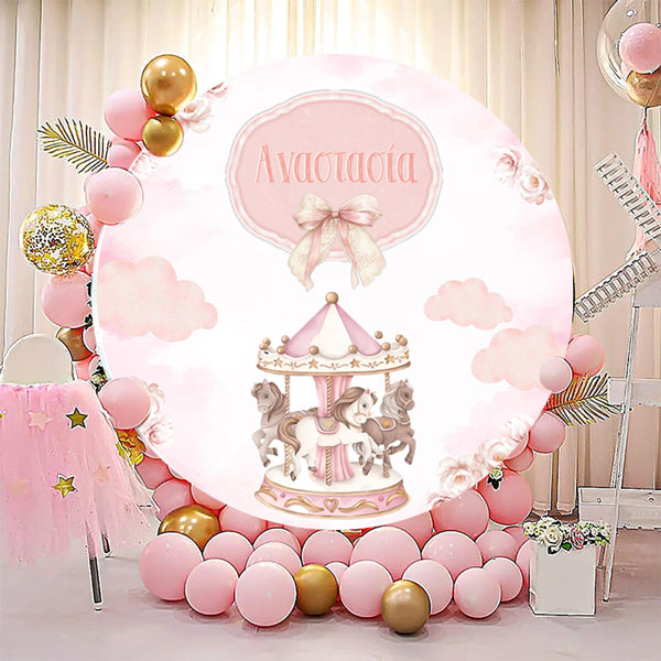 Στρογγυλή αφίσα από μουσαμά με θέμα Ροζ Καρουζέλ Στρογγυλή 1,30m, για να διακοσμήσετε το χώρο της βάπτισης του μωρού σας!