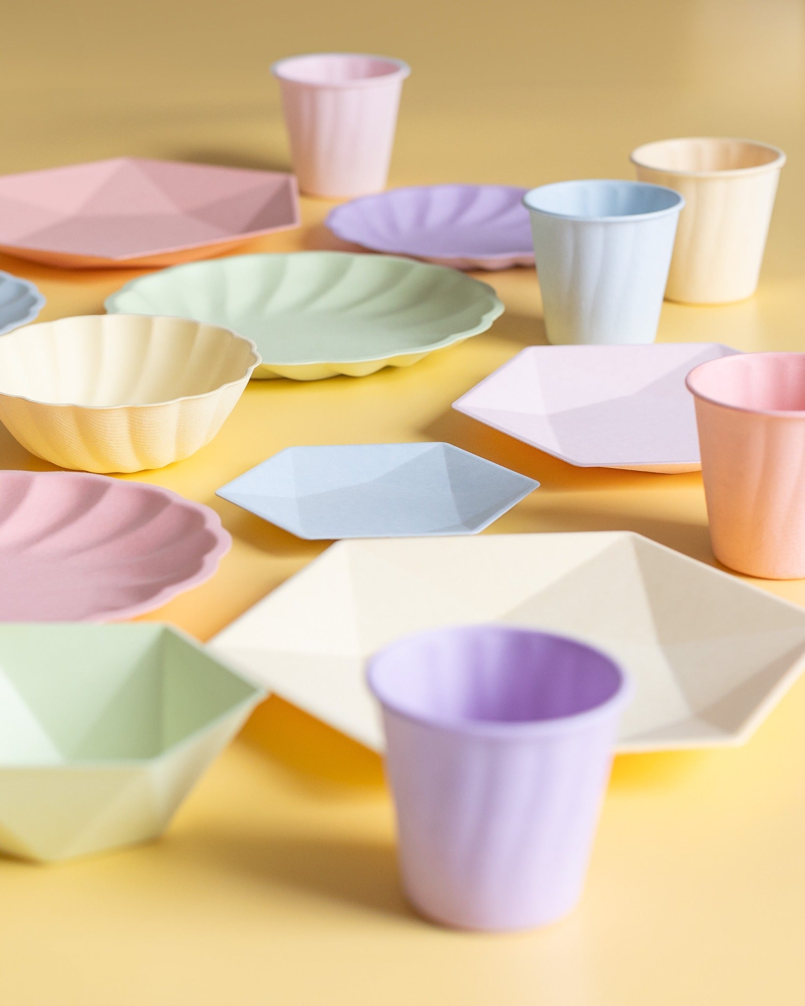 Πιάτα φαγητού Vert Décor σε μοναδικά σχήματα και όμορφα, παστέλ χρώματα, καθιστώντας τα την τέλεια επιλογή για το γιορτινό τραπέζι, το πάρτυ ή τη βάπτιση! Είναι κατασκευασμένα από κομποστοποιήσιμο ζαχαροκάλαμο βαγάσσης (υποπροϊόν της επεξεργασίας ζαχαροκάλαμου και μπαμπού) και δεν περιέχουν πλαστικό! Η σειρά Vert Decor συνδυάζει την κομψότητα και την οικολογία σε μια ολόκληρη σειρά μοναδικών επιτραπέζιων σκευών για πάρτι κατασκευασμένα από ταχέως ανανεώσιμες πρώτες ύλες. Τα προϊόντα αποτελούνται από ζαχαροκάλαμο (77%), μπαμπού (9%), AKD (4%) και νερό.