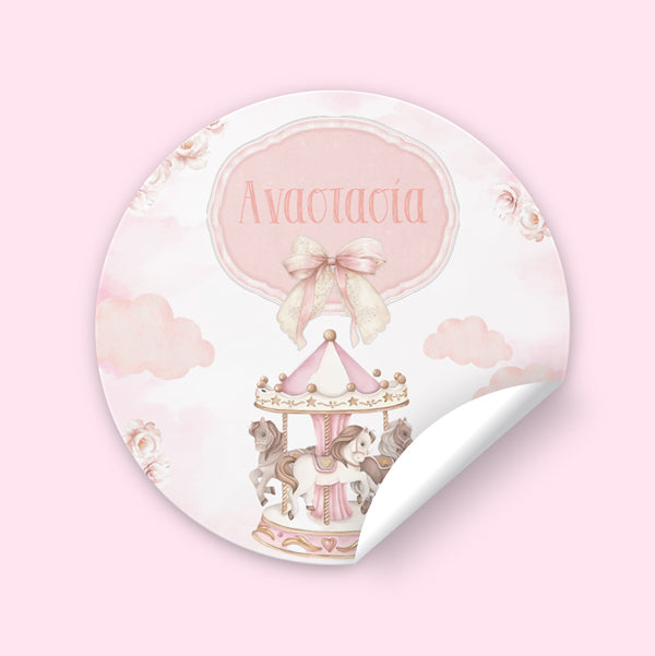 Στρογγυλά προσωποποιημένα αυτοκόλλητα με θέμα Ροζ Καρουζέλ. Μπορείτε να τα χρησιμοποιήσετε σε κουτάκια μπομπονιέρας, σε μπουκάλια και ποτήρια ή σε οποιοδήποτε άλλο αντικείμενο θέλετε να διακοσμήσετε για τη βάπτιση ή το πάρτυ.