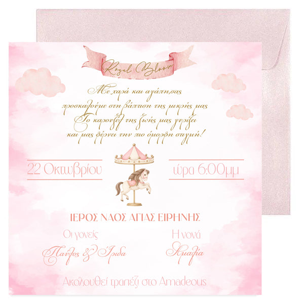 Προσκλητήριο Βάπτισης με θέμα Ροζ Καρουζέλ, για να μοιράσετε στους αγαπημένους σας για τη βάπτιση του μικρού σας και να κλέψετε τις εντυπώσεις.