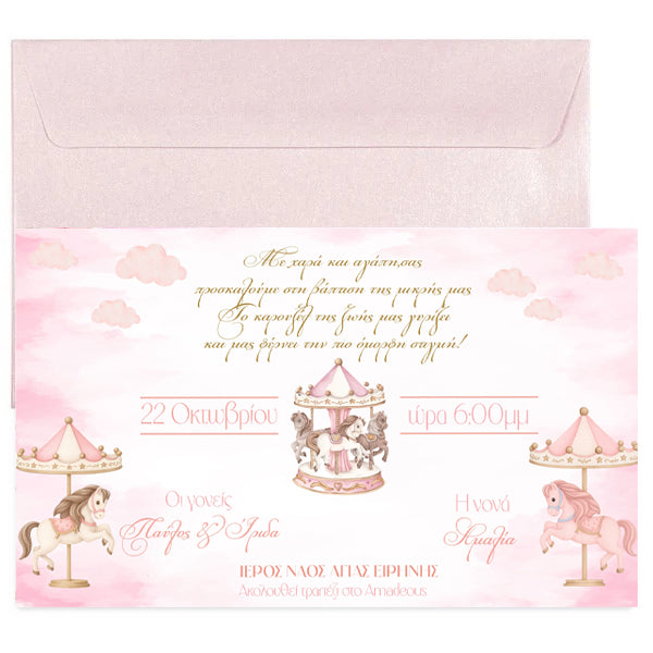 Προσκαλέστε τα αγαπημένα σας άτομα στην βάπτιση του μωρού σας με προσκλητήριο στο πιο γλυκό θέμα Ροζ Καρουζέλ Με Μακρόστενο Φάκελο!