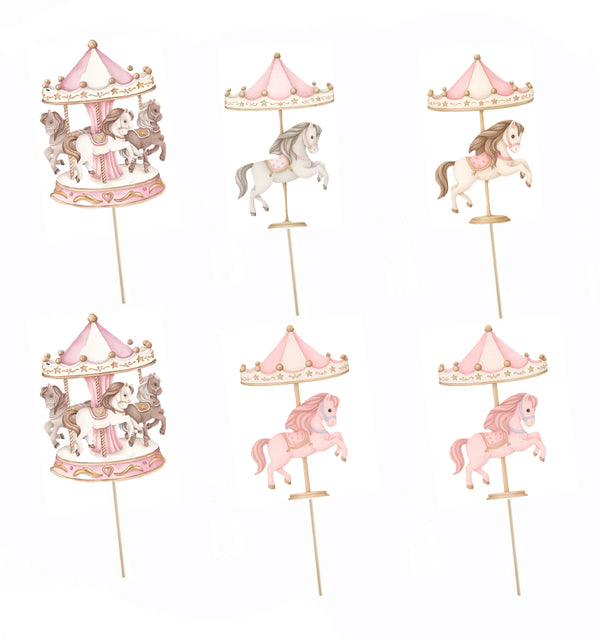 Topper-Οδοντογλυφίδες Ροζ Καρουζέλ (6 τεμ) , για να στολίσετε τα ζαχαρωτά και τα φαγητά του θεματικού πάρτυ η βάπτισης και να εντυπωσιάσετε!