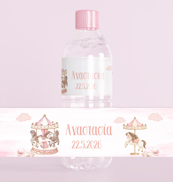 Ετικέτες για μπουκαλάκια νερού με θέμα Ροζ Καρουζέλ (8 τεμ) και εκτυπωμένο το όνομα του μωρού σας.
