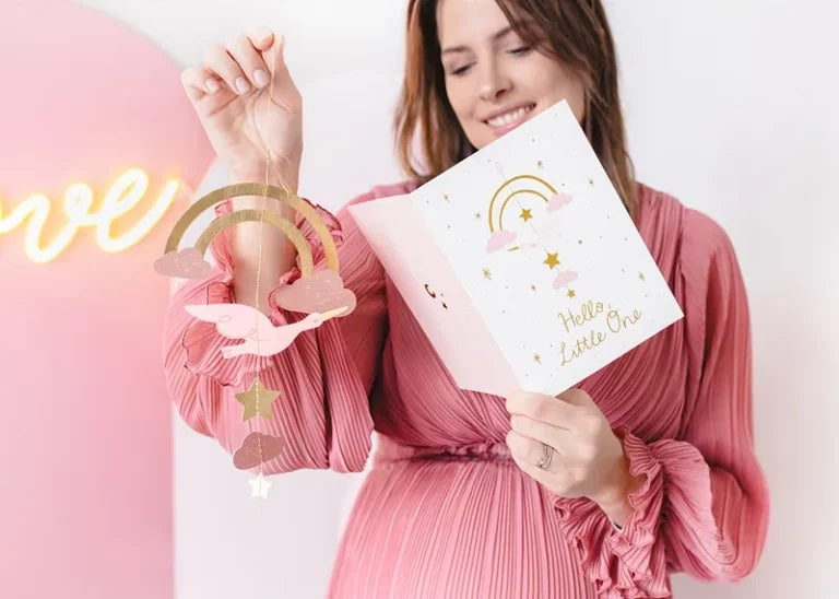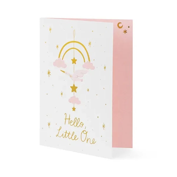 Ευχετήρια ροζ κάρτα με εκτύπωση ''Hello Little One"" και μαζί κρεμαστό διακοσμητικό στο ίδιο θέμα, για να το στολίσει η μαμά το παιδικό δωμάτιο!