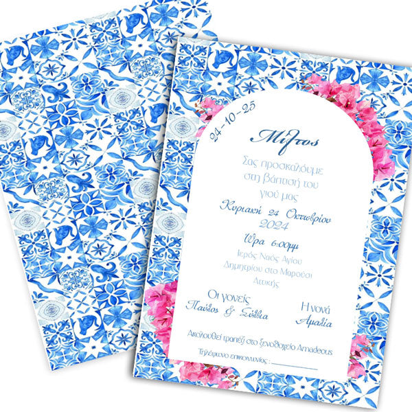 Μονόκαρτο προσκλητήριο με θέμα Βουκαμβίλια, για να καλέσετε τα αγαπημένα σας άτομα στη βάπτιση του μωρού σας!