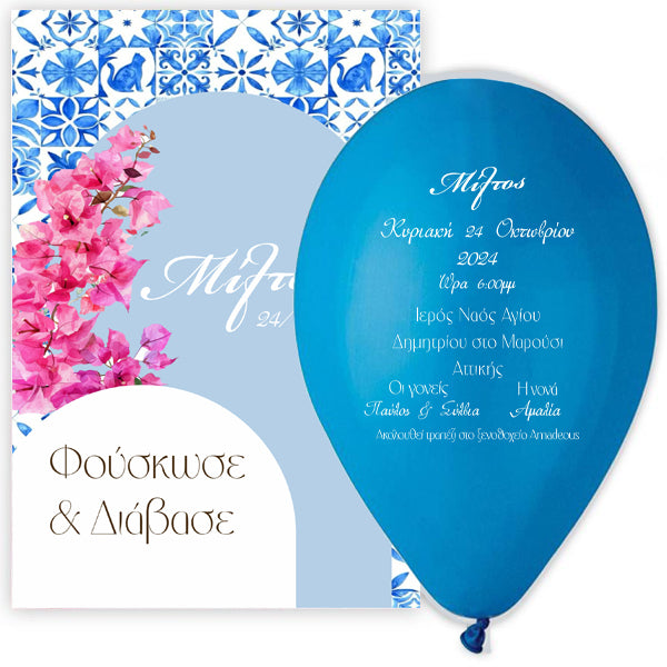 Πρωτότυπο προσκλητήριο βάπτισης σε τυπωμένο μπαλόνι με θέμα Βουκαμβίλια. Οι καλεσμένοι θα πρέπει να φουσκώσουν το τυπωμένο μπαλόνι για να μάθουν τις λεπτομέρειες της βάπτισης!