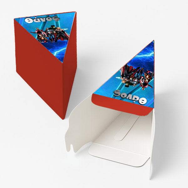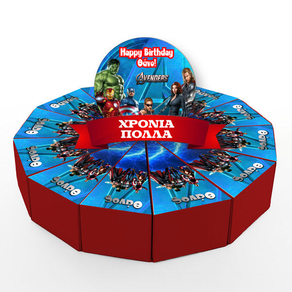 Χάρτινη τούρτα με θέμα Avengers, με το όνομα του παιδιού & εντυπωσιακό design. Η χάρτινη τούρτα αποτελείται από 12 ξεχωριστά κομμάτια, τα οποία όταν συναρμολογηθούν σχηματίζουν έναν ολοκληρωμένο κύκλο – μια εντυπωσιακή παρουσίαση για κάθε είδους εκδήλωση. Κάθε κομμάτι είναι σχεδιασμένο σαν φέτα τούρτας και λειτουργεί ταυτόχρονα ως κουτάκι, ιδανικό για γλυκά ή μικρά δωράκια.