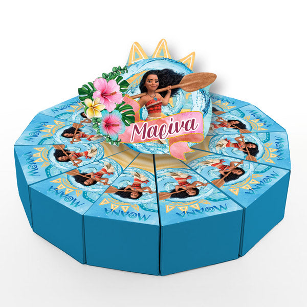 Χάρτινη τούρτα με θέμα Μοάνα, με το όνομα του παιδιού & εντυπωσιακό design. Η χάρτινη τούρτα αποτελείται από 12 ξεχωριστά κομμάτια, τα οποία όταν συναρμολογηθούν σχηματίζουν έναν ολοκληρωμένο κύκλο – μια εντυπωσιακή παρουσίαση για κάθε είδους εκδήλωση. Κάθε κομμάτι είναι σχεδιασμένο σαν φέτα τούρτας και λειτουργεί ταυτόχρονα ως κουτάκι, ιδανικό για γλυκά ή μικρά δωράκια.