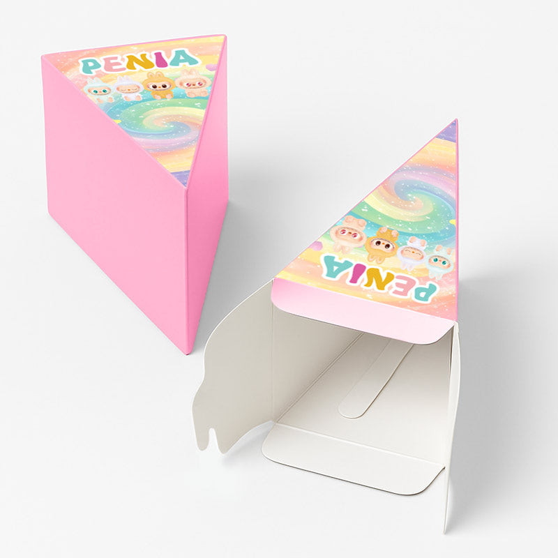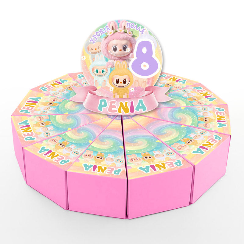 Χάρτινη τούρτα με θέμα LABUBU, με το όνομα του παιδιού & εντυπωσιακό design. Η χάρτινη τούρτα αποτελείται από 12 ξεχωριστά κομμάτια, τα οποία όταν συναρμολογηθούν σχηματίζουν έναν ολοκληρωμένο κύκλο – μια εντυπωσιακή παρουσίαση για κάθε είδους εκδήλωση. Κάθε κομμάτι είναι σχεδιασμένο σαν φέτα τούρτας και λειτουργεί ταυτόχρονα ως κουτάκι, ιδανικό για γλυκά ή μικρά δωράκια.