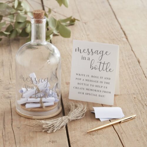 Γυάλινο μπουκάλι για να γράψουν ευχές οι καλεσμένοι του γάμου ή τηε βάπτισης! Μπορείς να το κρατήσεις ως ενθύμιο και να το διακοσμήσεις στο χώρο σου!Περιλαμβάνονται: