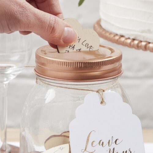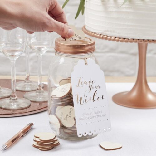 Χρησιμοποιήστε αυτό το εντυπωσιακό Wishing Jar ως εναλλακτικό βιβλίο ευχών στο γάμο ή τη βάπτιση. Το γυάλινο βάζο συνοδεύεται από ρομαντικό καπάκι σε ροζ χρυσό, με υποδοχή και 100 ξύλινες καρδιές. Οι καλεσμένοι σας μπορούν να γράψουν τις ιδιαίτερες ευχές τους στη νύφη και τον γαμπρό στις κενές καρδιές και να τις βάλουν στο βάζο. Θυμηθείτε ξανά τις μαγικές σας αναμνήσεις για τα επόμενα χρόνια.