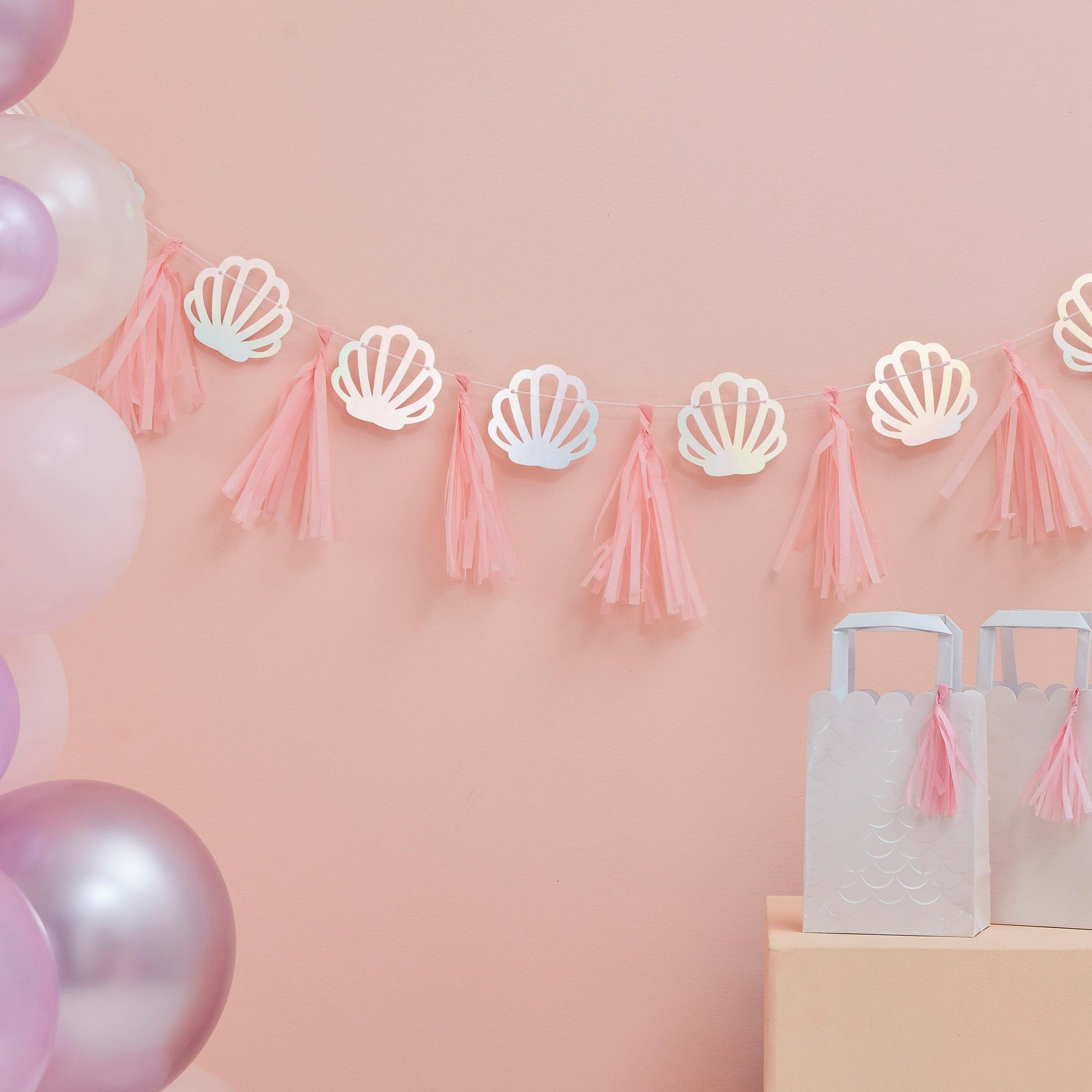 Διακοσμητική Γιρλάντα με Ιριδίζοντα Κοχύλια και ροζ φούντες για ένα μαγευτικό mermaid party!Περιλαμβάνονται: