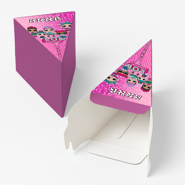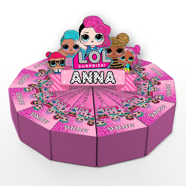 Χάρτινη τούρτα με θέμα Lol Surprise, με το όνομα του παιδιού & εντυπωσιακό design. Η χάρτινη τούρτα αποτελείται από 12 ξεχωριστά κομμάτια, τα οποία όταν συναρμολογηθούν σχηματίζουν έναν ολοκληρωμένο κύκλο – μια εντυπωσιακή παρουσίαση για κάθε είδους εκδήλωση. Κάθε κομμάτι είναι σχεδιασμένο σαν φέτα τούρτας και λειτουργεί ταυτόχρονα ως κουτάκι, ιδανικό για γλυκά ή μικρά δωράκια.
