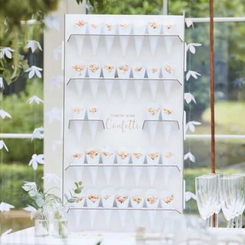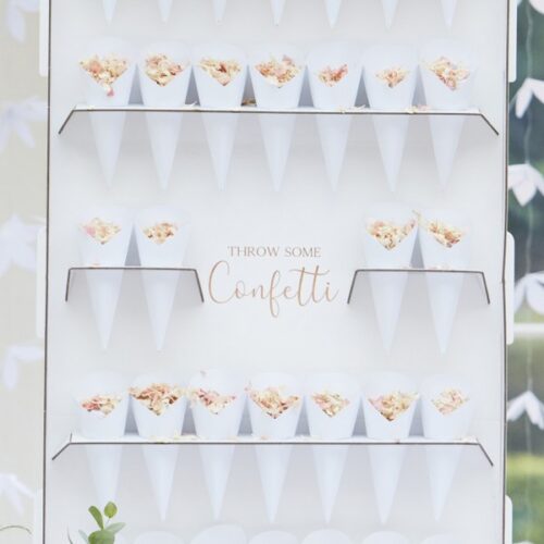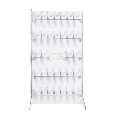 Σταντ - τοίχος με 32 θέσεις για χωνάκια και μήνυμα ""Throw some confetti""! Γέμισε τα χωνάκια με λουλούδια, ρύζι ή κομφετί, τοποθέτησε την βάση στο τραπέζι της δεξίωσης ή στο candy bar της εκκλησίας για να πάρουν οι καλεσμένοι!