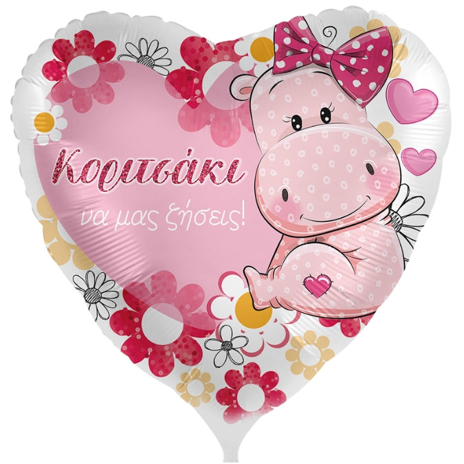 Μπαλόνι καρδιά με σχέδιο γλυκό Ιποπόταμο και μήνυμα "Κοριτσάκι να μας ζήσεις". Χαρίστε στο μωράκι σας την καλύτερη υποδοχή!