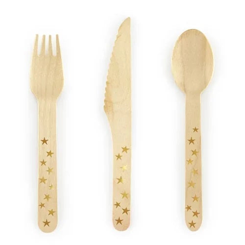 Ξύλινα οικολογικά μαχαιροπίρουνα με χρυσά αστέρια, για το τραπέζι του πάρτυ, της βάπτισης ή της εκδήλωσης!