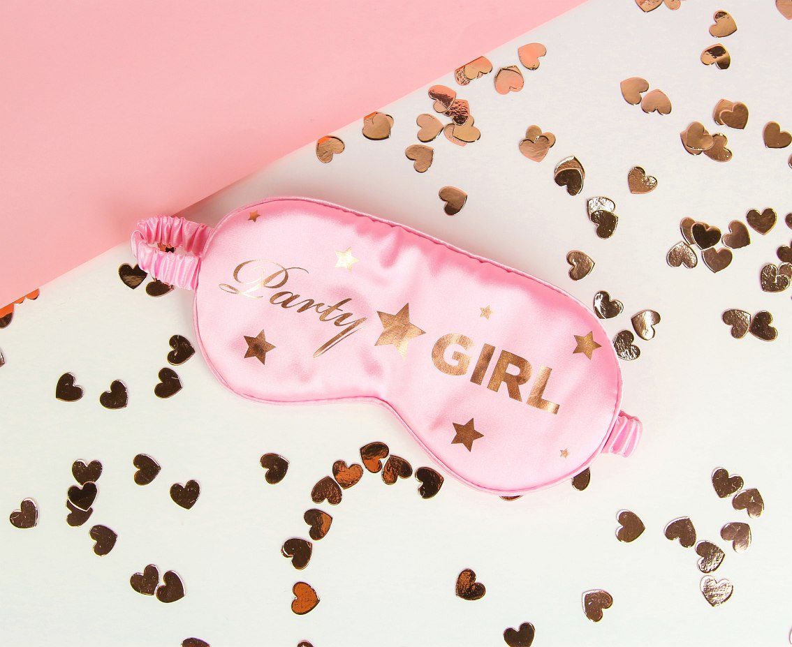 Υφασμάτινη μάσκα ύπνου party girl σε ροζ χρώμα & rosegold γράμματα για να φορέσεις με τις φίλες σου στο πιτζάμα πάρτυ ή στο πάρτυ γενεθλίων!