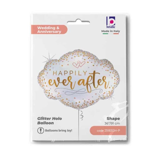 Μπαλόνι σε σχήμα σύννεφου με τη φράση “Happily Ever After”, ιδανικό για γάμους, αρραβώνες ή επετείους. Διακοσμημένο με χρυσά, ασημί και ροζ κομφετί και δύο μικρές καρδιές στο Εεπάνω μέρος.