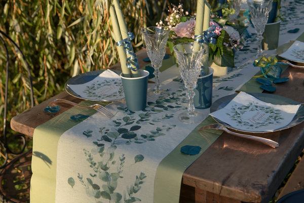 Runner τραπεζιού με σχέδιο φύλλα Ευκάλυπτου, για να στολίσεις όμορφα τον μπουφέ της εκδήλωσης!