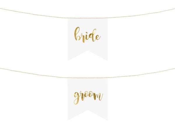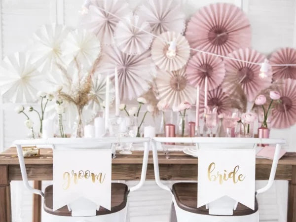 Διακοσμητικά για τις καρέκλες των νεόνυμφων Bride & Groom σε λευκό χρώμα με χρυσές λεπτομέρειες!