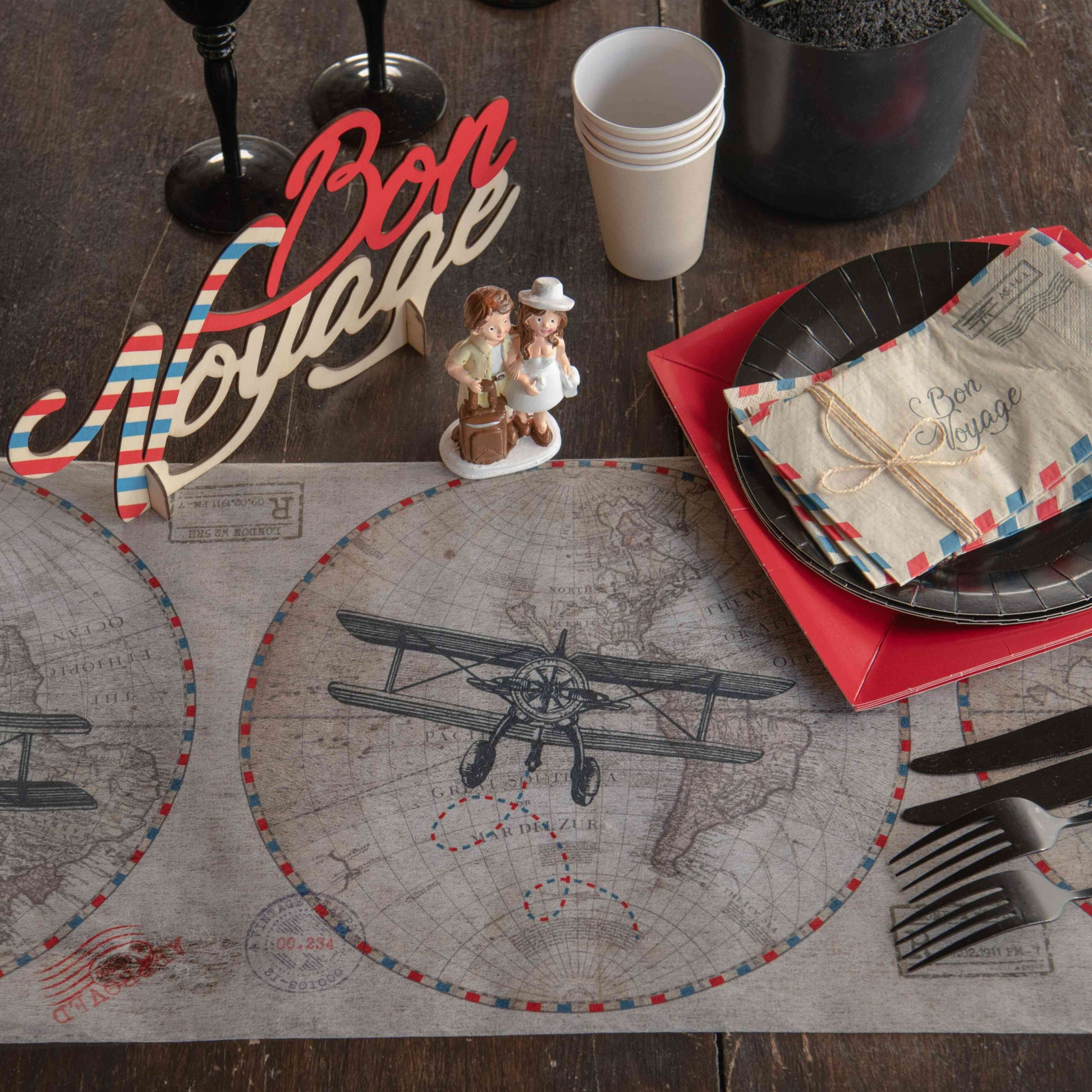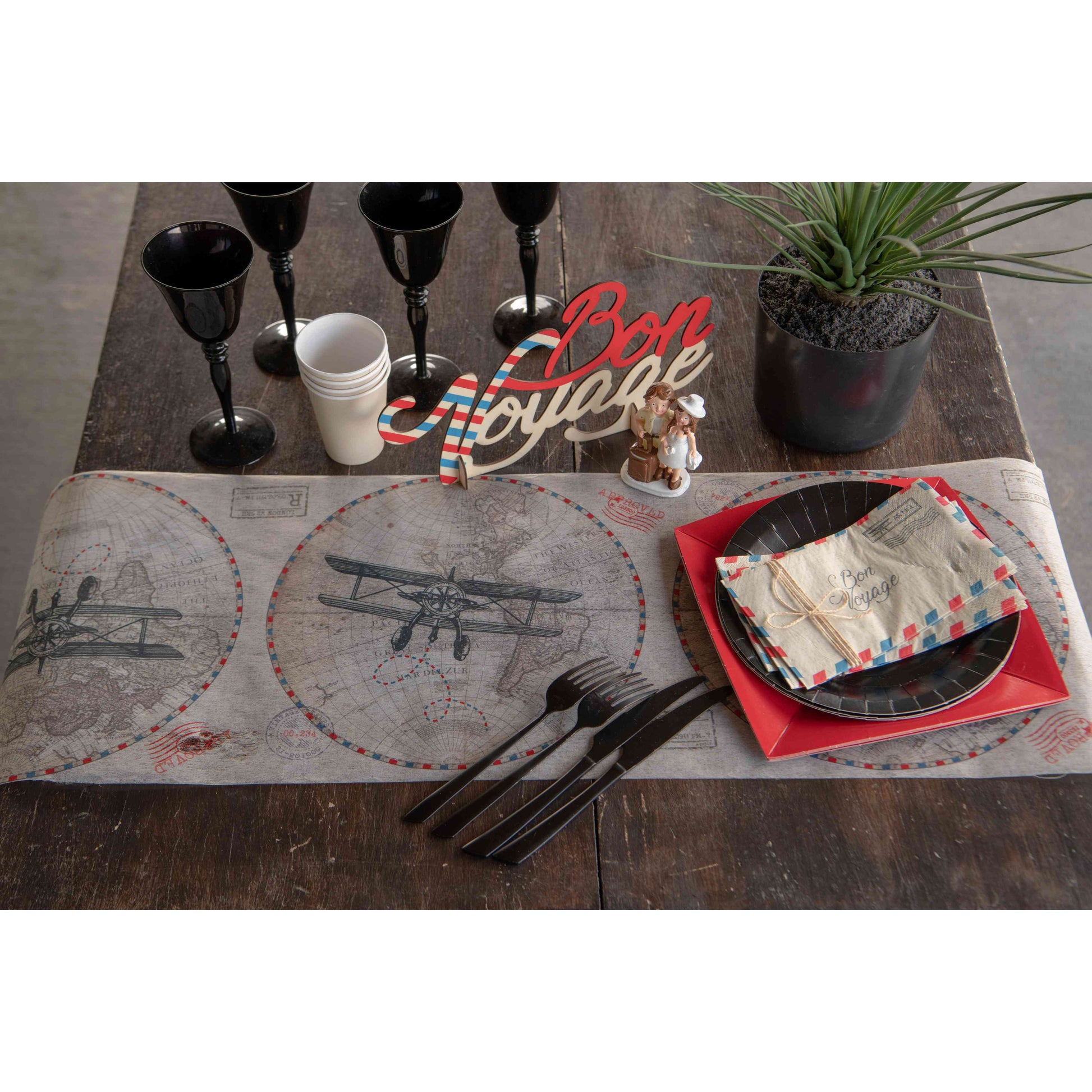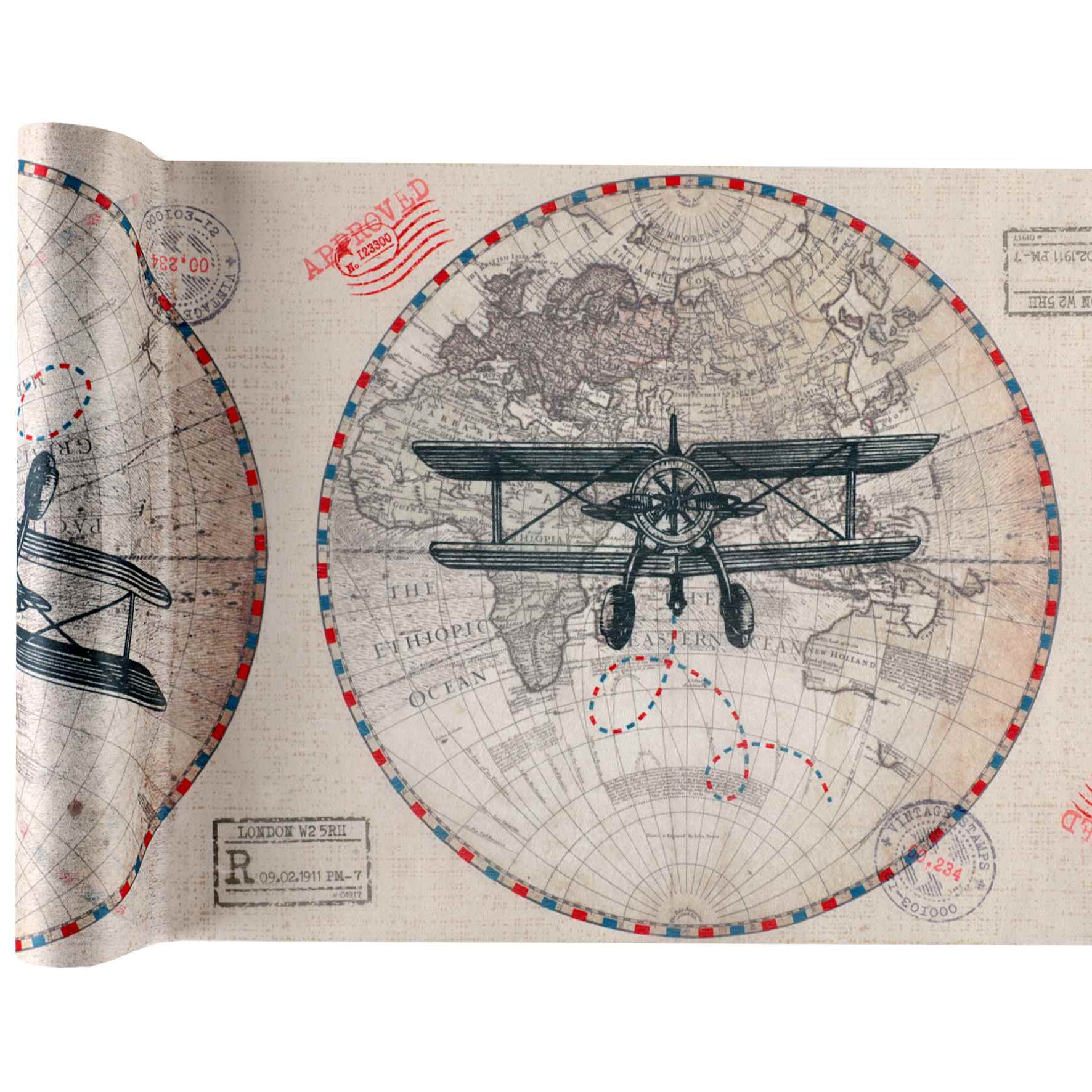 Runner με σχέδιο vintage αεροπλάνο και παγκόσμιο χάρτη, για να διακοσμήσεις το τραπέζι του πάρτυ ή της βάπτισης με θέμα τα ταξίδια!