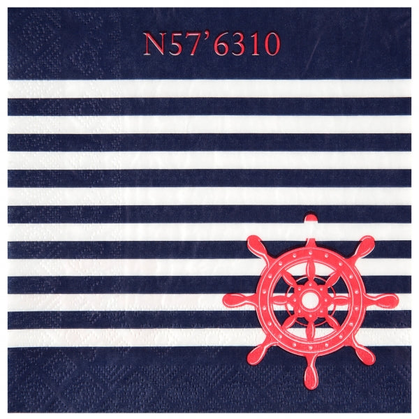 Χαρτοπετσέτες με κόκκινο πηδάλιο, μπλε ρίγες και συντεταγμένες, για να διακοσμήσεις το γιορτινό τραπέζι με ναυτικό θέμα.
