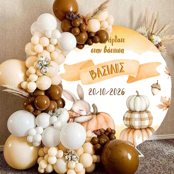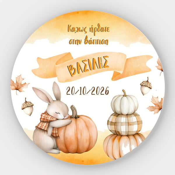 Στρογγυλή Αφίσα Βάπτισης Κολοκύθα με Λαγουδάκι και εκτυπωμένο το μήνυμα που θέλετε, για να διακοσμήσετε το χώρο της βάπτισης του μωρού σας!