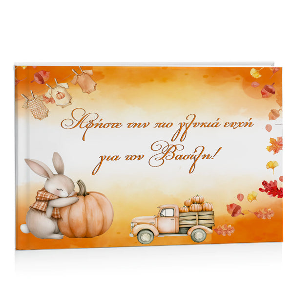 Εντυπωσιακό ευχολόγιο για τη βάπτιση του μωρού σας με θέμα Κολοκύθα με Λαγουδάκι! Κρατήστε για πάντα τις ευχές των καλεσμένων σας σε ένα όμορφο ευχολόγιο.