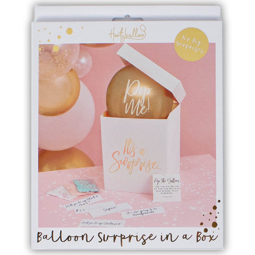 - Κάθε σετ περιέχει: 1 x χάρτινο κουτί με καπάκι, 1 x κάρτα 'pop the balloon' με καρφίτσα, 2 x χρυσά μπαλόνια, 2 x λευκής σατέν κορδέλας, 3 x διαφορετικά σακουλάκια με χρωματιστό κομφετί και 8 x τυπωμένες κάρτες έκπληξη. Όταν συναρμολογηθεί, το κουτί έχει διαστάσεις περίπου 25 cm (Π) x 25 cm (Β) x 28 cm (Υ)