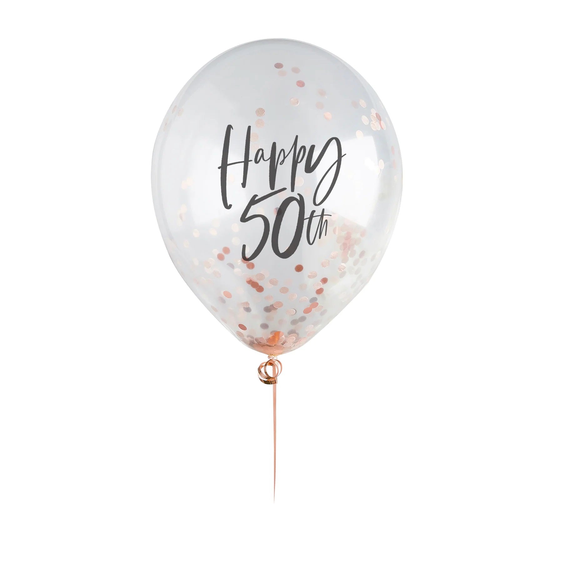 Πάρτι γενεθλίων χωρίς μπαλόνια γίνεται; Εντυπωσιακά latex διάφανα μπαλόνια με κομφετί σε ροζ-χρυσή απόχρωση και μήνυμα 'Happy 50th'!