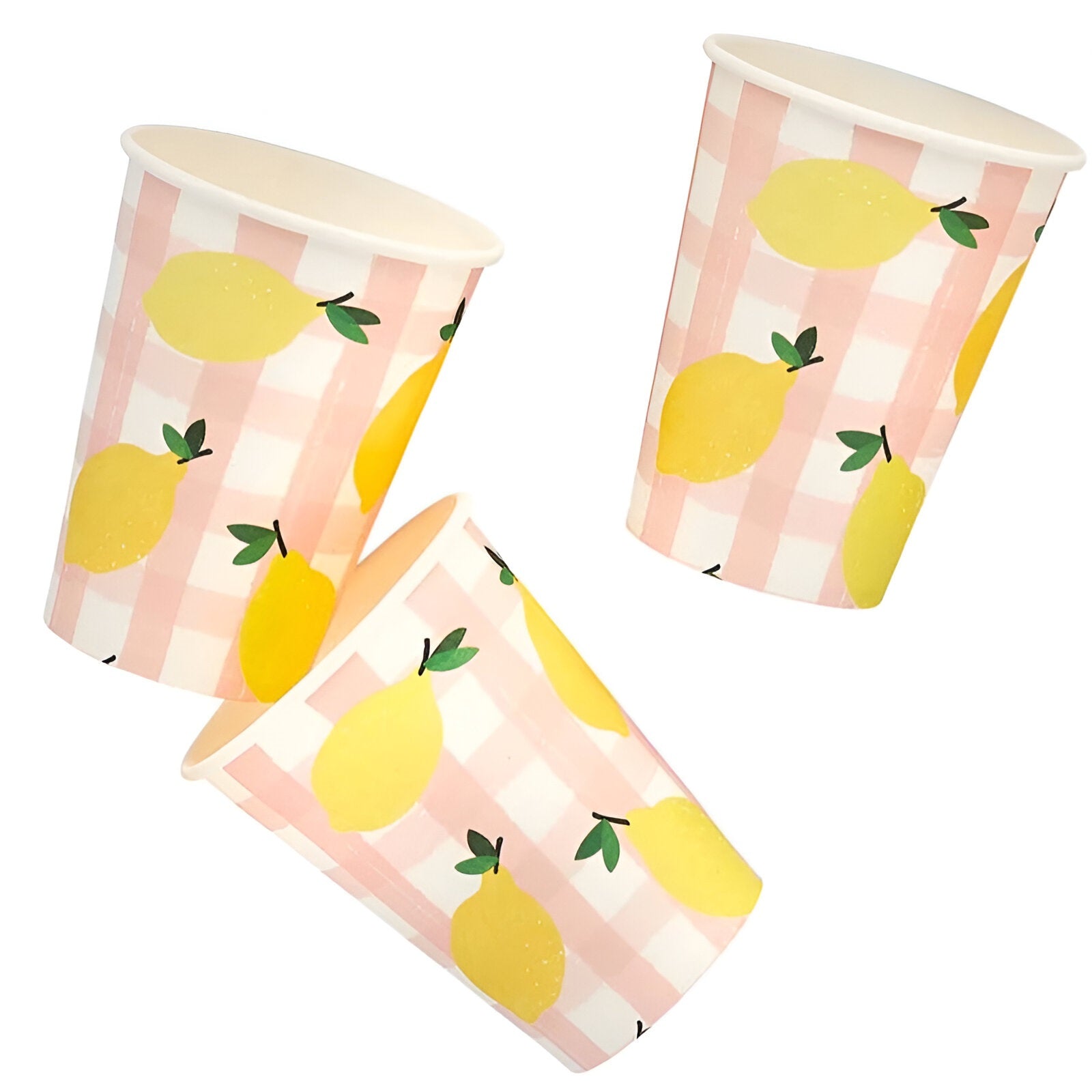 Ποτήρια χάρτινα με σχέδιο λεμόνι σε ροζ καρό φόντο, για να κεραστούν οι καλεσμένοι στην εκδήλωση!
