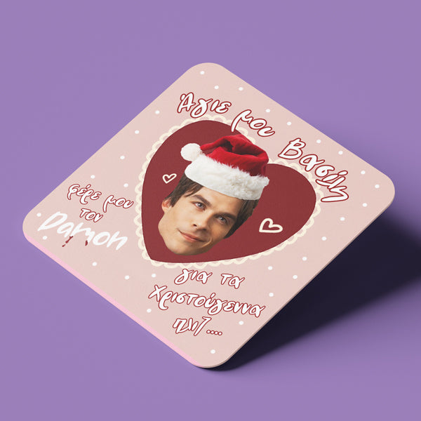 Ξύλινο σουβέρ Χιουμοριστικό Φέρε μου τον Damon, για να ακουμπάς την κούπα σου ή να χαρίσεις στον φίλο ή την φίλη που λατρεύει την περίοδο των Χριστουγέννων!