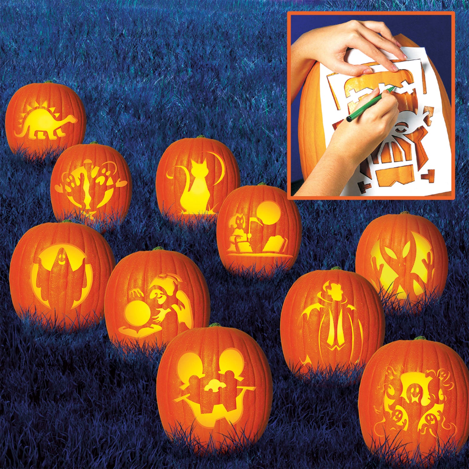 Draw elegant, detailed pumpkin designs with ease with these stencils to create patterns of ghosts, grim reapers, cats, witches, aliens, and more